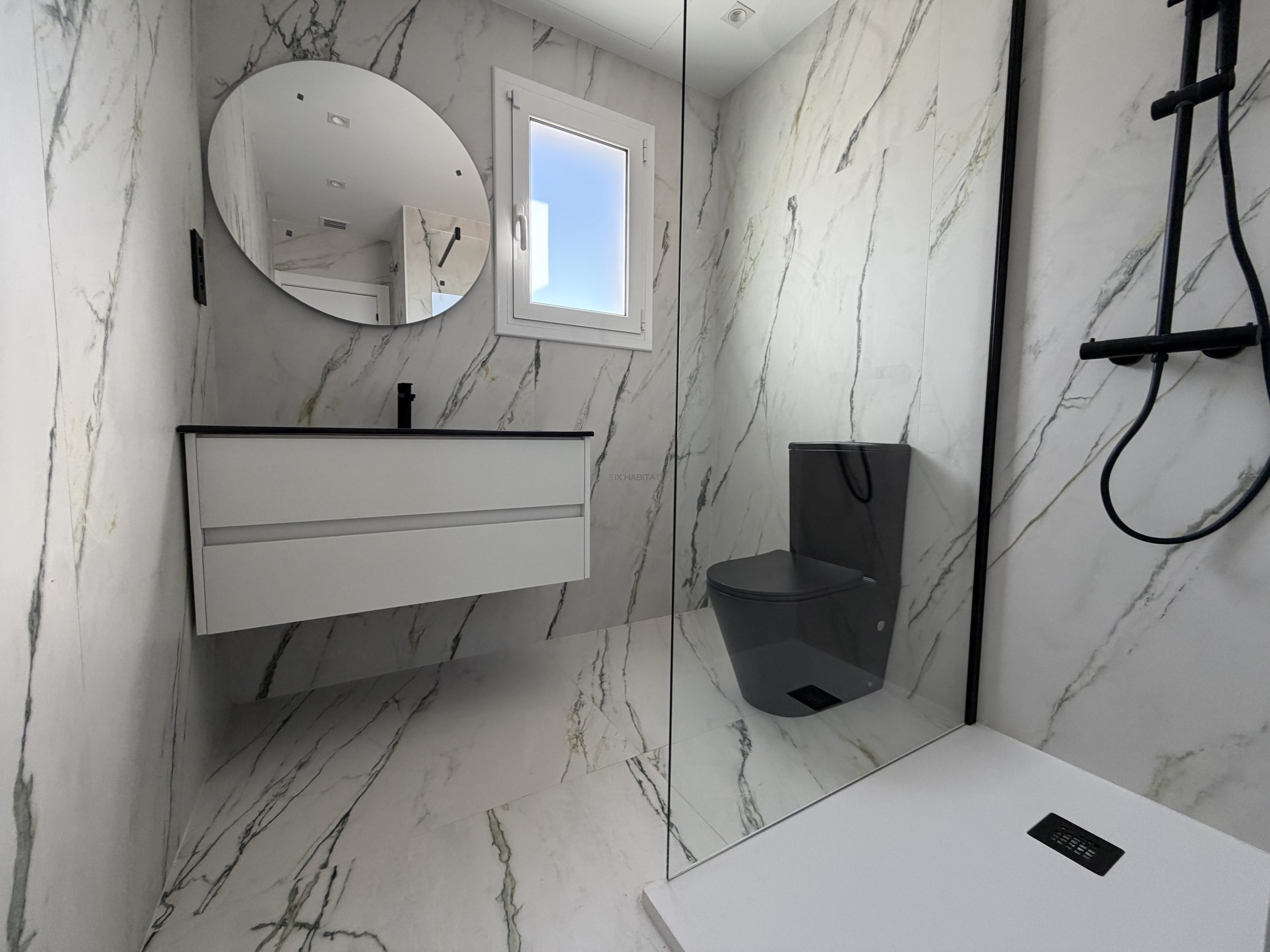 El baño, de diseño contemporáneo, ha sido ejecutado con materiales de alta calidad, líneas limpias y una cuidada iluminación, ofreciendo una experiencia elegante y funcional, en armonía con el estilo del resto de la vivienda.