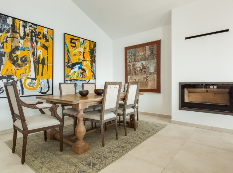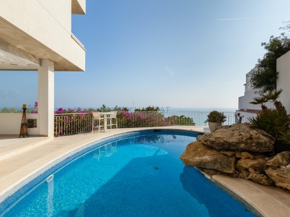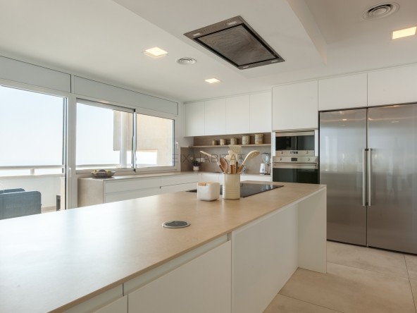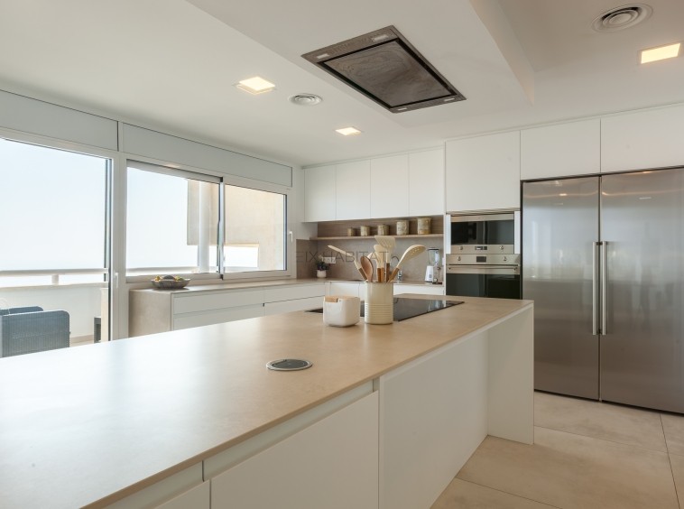 La zona noble de la vivienda ofrece un espacio social de gran presencia, donde salón y comedor dialogan con el exterior a través de amplios ventanales, enmarcando el Mediterráneo como protagonista permanente. La chimenea aporta calidez y sofisticación, mientras que la cocina de diseño, completamente renovada, equipada con electrodomésticos de alta gama, combina funcionalidad y estética contemporánea. Este nivel incorpora aseo de cortesía y climatización por conductos frío/calor.