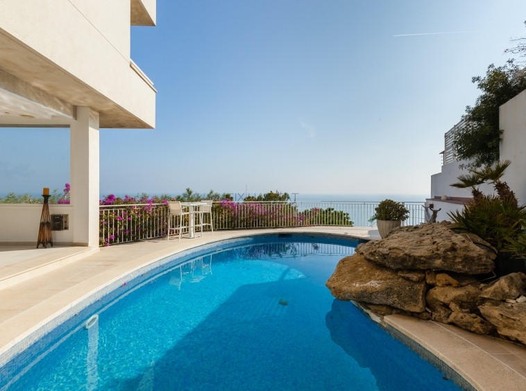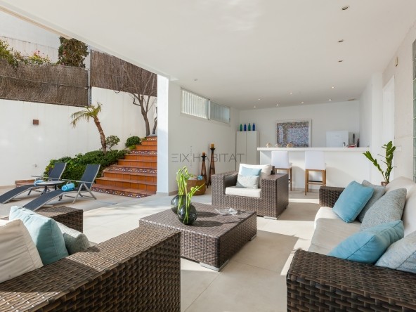 El espacio exterior ha sido concebido como un auténtico resort privado: jardín, piscina y una elegante zona chill-out con barra de bar, diseñada para eventos, celebraciones y momentos de relax con el Mediterráneo como telón de fondo. La conexión directa entre la zona social exterior y la piscina refuerza la sensación de continuidad y exclusividad.