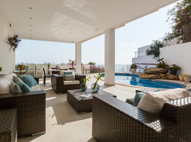 Desde estas estancias se accede a una terraza panorámica frente al mar, un escenario privilegiado para la vida al aire libre, concebido para largas sobremesas, atardeceres inolvidables y encuentros sociales en un entorno de absoluto privilegio.